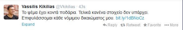 «Το ψέμα έχει κοντά ποδάρια. Τελικά κανένα στοιχείο δεν υπάρχει. Επιφυλάσσομαι κάθε νόμιμου δικαιώματος μου» γράφει ο Βασίλης Κικίλιας στον προσωπικό του λογαριασμό στο twitter, ενώ παραθέτει και link από την ανακοίνωση του υπουργείου Οικονομικών, σχετικά με τον έλεγχο που πραγματοποιείται για αδήλωτα εμβάσματα πολιτικών στο εξωτερικό.