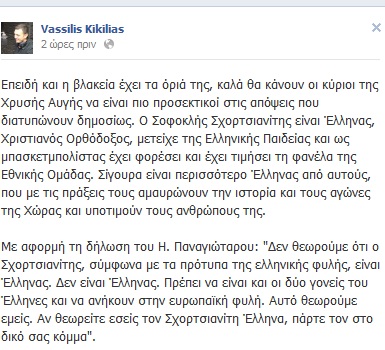Την έντονη αντίδραση του βουλευτή Βασίλη Κικίλια προκάλεσαν οι δηλώσεις του Ηλία Παναγιώταρου για τον Σοφοκλή Σχορτσιανίτη. Δείτε τι έγραψε στην προσωπική του σελίδα στο Facebook: