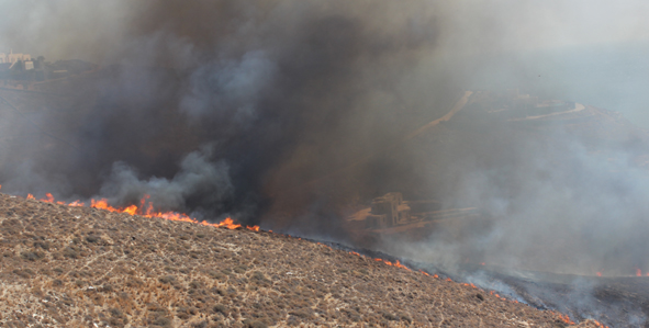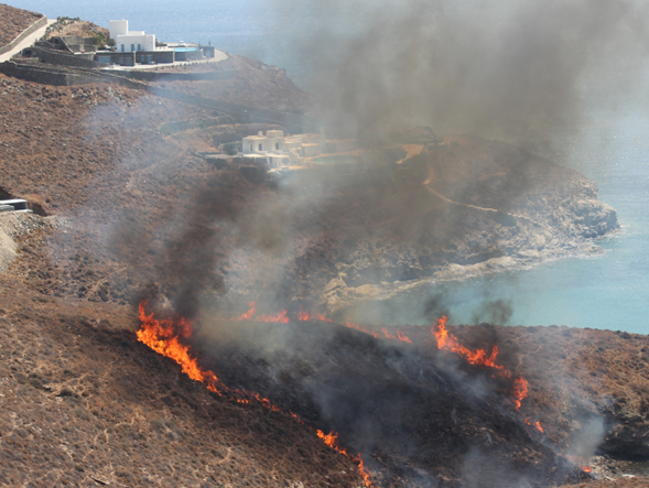 Η πυρκαγιά που ξέσπασε το πρωί του Σαββάτου στη θέση Κάβος του Τ.Δ. Ποσειδωνίας εξαπλώθηκε με θεαματική ταχύτητα λόγω των πολύ ισχυρών ανέμων απείλησε εξοχικές κατοικίες, μεταξύ αυτών και τα σπίτια των δύο πολιτικών προσώπων που βρίσκονται σε απόσταση αναπνοής και γειτνιάζουν μεταξύ τους.