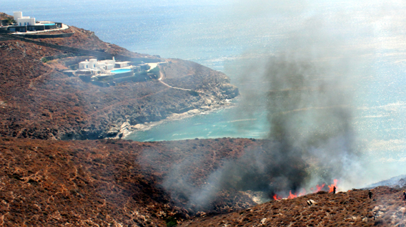 Κινδύνευσαν να γίνουν στάχτη οι πολυτελείς εξοχικές κατοικίες του υπουργού Οικονομικών Γιάννη Στουρνάρα και του πρώην υπουργού Γιάννου Παπαντωνίου στην περιοχή Τρία Λαγγόνια στο Νότιο άκρο της Σύρου.