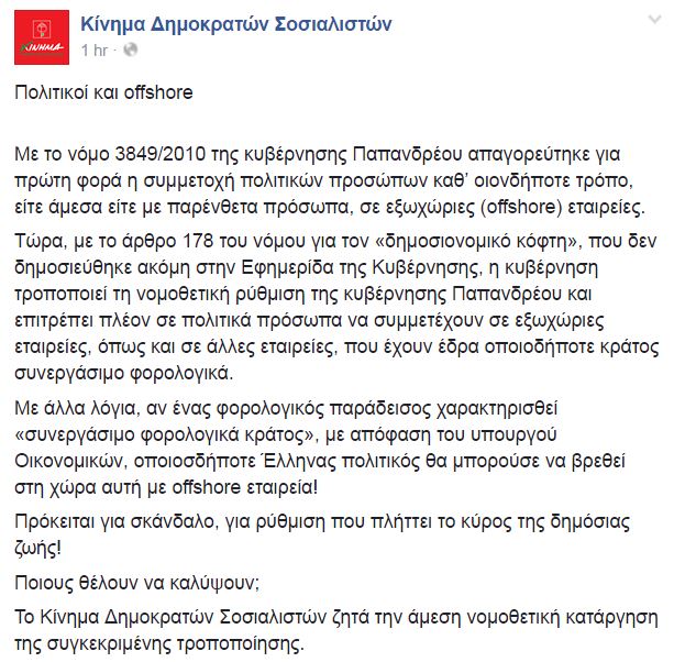«Με άλλα λόγια, αν ένας φορολογικός παράδεισος χαρακτηρισθεί «συνεργάσιμο φορολογικά κράτος», με απόφαση του υπουργού Οικονομικών, οποιοσδήποτε Έλληνας πολιτικός θα μπορούσε να βρεθεί στη χώρα αυτή με offshore εταιρεία! Πρόκειται για σκάνδαλο, για ρύθμιση που πλήττει το κύρος της δημόσιας ζωής! Ποιους θέλουν να καλύψουν; Το Κίνημα Δημοκρατών Σοσιαλιστών ζητά την άμεση νομοθετική κατάργηση της συγκεκριμένης τροποποίησης», προσθέτει.