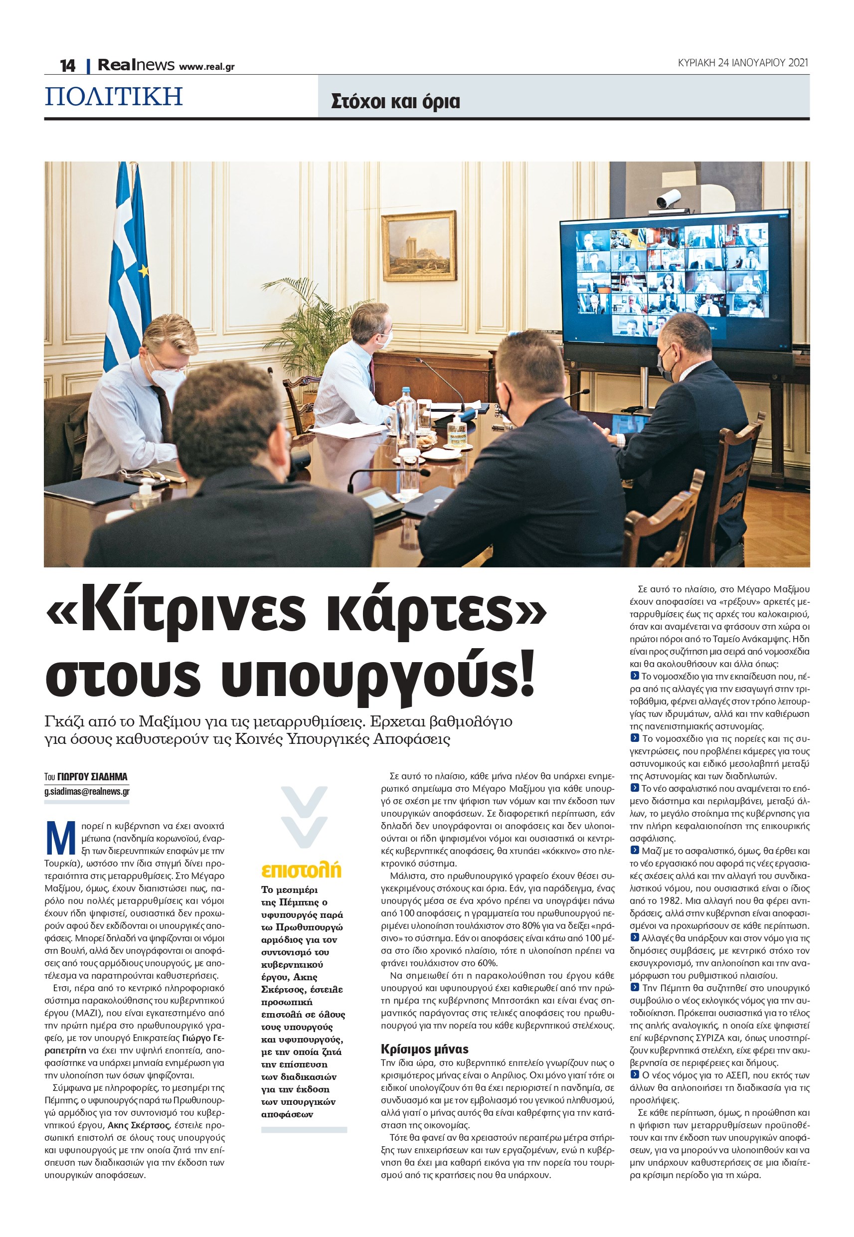 Γκάζι από το Μαξίμου για τις μεταρρυθμίσεις. Ερχεται βαθμολόγιο για όσους καθυστερούν τις Κοινές Υπουργικές Αποφάσεις. Μπορεί η κυβέρνηση να έχει ανοιχτά μέτωπα (πανδημία κορονοϊού, έναρξη των διερευνητικών επαφών με την Τουρκία), ωστόσο την ίδια στιγμή δίνει προτεραιότητα στις μεταρρυθμίσεις. Στο Μέγαρο Μαξίμου, όμως, έχουν διαπιστώσει πως, παρόλο που πολλές μεταρρυθμίσεις και νόμοι έχουν ήδη ψηφιστεί, ουσιαστικά δεν προχωρούν αφού δεν εκδίδονται οι υπουργικές αποφάσεις. Μπορεί δηλαδή να ψηφίζονται οι νόμοι στη Βουλή, αλλά δεν υπογράφονται οι αποφάσεις από τους αρμόδιους υπουργούς, με αποτέλεσμα να παρατηρούνται καθυστερήσεις. Ετσι, πέρα από το κεντρικό πληροφοριακό σύστημα παρακολούθησης του κυβερνητικού έργου (ΜΑΖΙ), που είναι εγκατεστημένο από την πρώτη ημέρα στο πρωθυπουργικό γραφείο, με τον υπουργό Επικρατείας Γιώργο Γεραπετρίτη να έχει την υψηλή εποπτεία, αποφασίστηκε να υπάρχει μηνιαία ενημέρωση για την υλοποίηση των όσων ψηφίζονται. Σύμφωνα με πληροφορίες, το μεσημέρι της Πέμπτης, ο υφυπουργός παρά τω Πρωθυπουργώ αρμόδιος για τον συντονισμό του κυβερνητικού έργου, Ακης Σκέρτσος, έστειλε προσωπική επιστολή σε όλους τους υπουργούς και υφυπουργούς με την οποία ζητά την επίσπευση των διαδικασιών για την έκδοση των υπουργικών αποφάσεων.