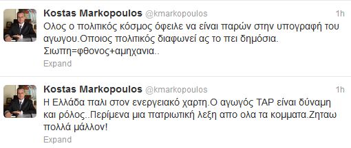 Ένα αινιγματικό tweet που μπορεί να ερμηνευτεί ως “άνοιγμα” στον Αντώνη Σαμαρά και τη ΝΔ έκανε ο Κώστας Μαρκόπουλος, με αφορμή την υπογραφή της συμφωνίας που αφορά στον αγωγό ΤΑΡ.