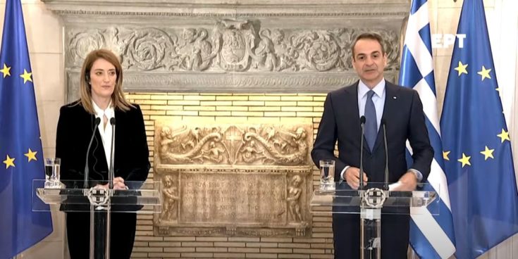 Δηλώσεις του Πρωθυπουργού Κυριάκου Μητσοτάκη με την Πρόεδρο του Ευρωπαϊκού Κοινοβουλίου Ρομπέρτα Μέτσολα.