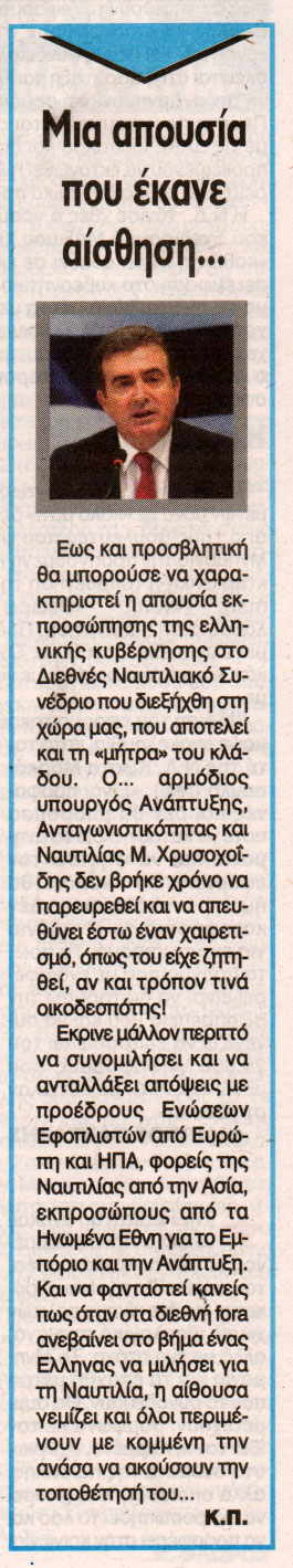Δεν βρήκε χρόνο να παρευρεθεί ή έστω να απευθύνει ένα χαιρετισμό στο Διεθνές Ναυτιλιακό Συνέδριο, που διεξήχθη στη χώρα μας και αποτελεί τη «μήτρα» του κλάδου, ο υπουργός Ανάπτυξης, Ανταγωνιστικότητας και Ναυτιλίας, Μ. Χρυσοχοΐδης, όπως του είχε ζητηθεί, σύμφωνα με δημοσίευμα του «Αδέσμευτου Τύπου».Άλλωστε ο κ. Χρυσοχοΐδης ήταν, τρόπον τινά, και ο οικοδεσπότης…