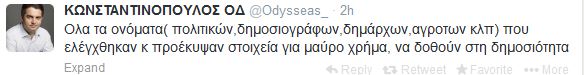 Την πεποίθηση ότι πρέπει να δημοσιευτούν όλα τα ονόματα που εμπλέκονται στην λίστα του μαύρου χρήματος, τόνισε μέσω του προσωπικού του λογαριασμού στο Twitter, ο Οδυσσέας Κωνσταντινόπουλος. Συγκεκριμένα ο βουλευτής του ΠΑΣΟΚ, έγραψε ότι : «Όλα τα ονόματα( πολιτικών, δημοσιογράφων, δημάρχων, αγροτών κλπ) που ελέγχθηκαν κ προέκυψαν στοιχεία για μαύρο χρήμα, να δοθούν στη δημοσιότητα».