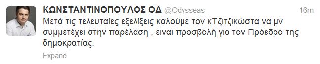 Ο εκπρόσωπος Τύπου του ΠΑΣΟΚ, Οδυσσέας Κωνσταντινόπουλος, απεύθυνε κάλεσμα στον Περιφερειάρχη Κεντρικής Μακεδονίας, Απ. Τζιτζικώστα να μην συμμετέχει στην παρέλαση.