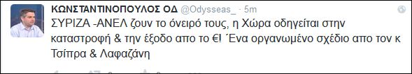 Επίθεση εναντίον της κυβέρνησης και προσωπικά κατά των Αλέξη Τσίπρα και Παναγιώτη Λαφαζάνη εξαπέλυσε μέσω Twitter ο Οδυσσέας Κωνσταντινόπουλος.