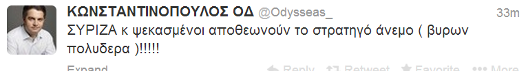 Επίθεση στους βουλευτές της αντιπολίτευσης αλλά και τον κ.Πολύδωρα εξαπέλυσε, κατά τη διάρκεια της ψηφοφορίας για τον φόρο ακινήτων, ο εκπρόσωπος τύπου του ΠΑΣΟΚ. Με σκωπτικό σχόλιο στο twitter έγραψε ο κ.Κωνσταντινόπουλος: “ΣΥΡΙΖΑ κ ψεκασμένοι αποθεωνούν το στρατηγό άνεμο ( βυρων πολυδερα )!!!!!”
