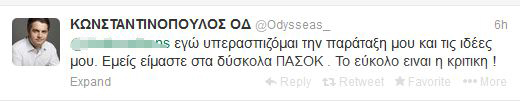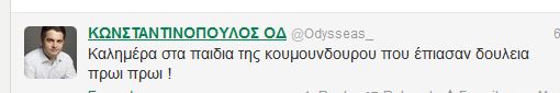 Καλημέρα μέσω Twitter επέλεξε να πει στα στελέχη του ΣΥΡΙΖΑ ο εκπρόσωπος Τύπου του ΠΑΣΟΚ Οδυσσέας Κωνσταντινόπουλος.