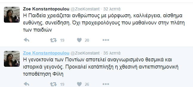 Συγκεκριμένα, η Ζωή Κωνσταντοπούλου έγραψε: «Η γενοκτονία των Ποντίων αποτελεί αναγνωρισμένο θεσμικά και ιστορικά γεγονός. Προκαλεί κατάπληξη η χθεσινή αντιεπιστημονική τοποθέτηση του Φίλη» και με δεύτερη ανάρτηση της προσθέτει: «Η Παιδεία χρειάζεται ανθρώπους με μόρφωση, καλλιέργεια, αίσθημα ευθύνης, συνείδηση. Όχι προχειρολόγους που μαθαίνουν στην πλάτη των παιδιών».