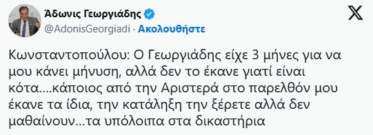 Από την πλευρά του ο υπουργός Υγείας, Άδωνις Γεωργιάδης με ανάρτησή του στο Χ το πρωί της Τρίτης ανέφερε ότι «Κάποιος από την Αριστερά στο παρελθόν μου έκανε τα ίδια, την κατάληξη την ξέρετε αλλά δεν μαθαίνουν…τα υπόλοιπα στα δικαστήρια».