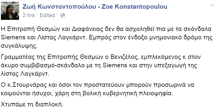 «Η Επιτροπή Θεσμών και Διαφάνειας δεν θα ασχοληθεί πια με τα σκάνδαλα Siemens και Λίστας Λαγκάρντ. Εμπρός στον ένδοξο μνημονιακό δρόμο της συγκάλυψης.