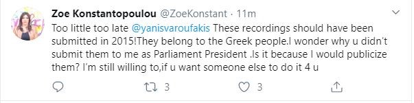 Με μία ανάρτηση στα αγγλικά στον επίσημο λογαριασμό της στο Twitter σχολίασε την απόφαση του Γιάνη Βαρουφάκη να παραδώσει τις ηχογραφήσεις των Eurogroup του 2015 στη Βουλή η επικεφαλής της Πλεύσης Ελευθερίας, Ζωή Κωνσταντοπούλου.Η κα. Κωνσταντοπούλου έκανε το tweet στα αγγλικά, τάγκαρε το προφίλ του κ. Βαρουφάκη και ανέφερε: «Πολύ λίγο πολύ αργά, @yanisvaroufakis. Αυτές οι ηχογραφήσεις θα έπρεπε να έχουν υποβληθεί το 2015. Αναρωτιέμαι γιατί δεν τις υποβάλλατε σε μένα ως Πρόεδρο της Βουλής. Είναι επειδή θα τις δημοσιοποιούσα; Είμαι ακόμα διατεθειμένη, αν θέλετε να το κάνει άλλος για εσάς».Δείτε την ανάρτηση: