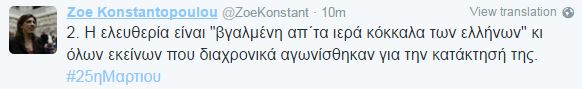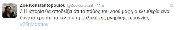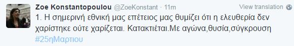 Μήνυμα για την επέτειο της 25ης Μαρτίου έστειλε μέσω του λογαριασμού της στο twitter η πρώην πρόεδρος της Βουλής, Ζωή Κωνσταντοπούλου.