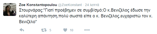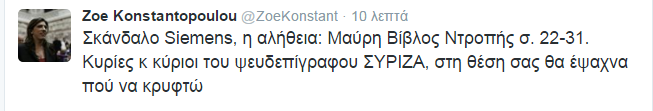Σκληρή επίθεση στον ΣΥΡΙΖΑ εξαπέλυσε η πρώην Πρόεδρος της Βουλής, Ζωή Κωνσταντοπούλου, με ανάρτηση της στο Τwitter, λέγοντας ότι στη θέση τους θα έψαχνε μέρος να κρυφτεί, ενώ στο στόχαστρο της βρέθηκε και ο πρώην υπουργός Οικονομικών και Διοικητή της Τράπεζας της Ελλάδας, Γιάννης Στουρνάρας.