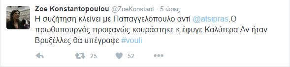 Η πρώην Πρόεδρος της Βουλής, Ζωή Κωνσταντοπούλου, με ειρωνικό ύφος έγραψε στο Twitter: «Η συζήτηση κλείνει με Παπαγγελόπουλο αντί για τον Τσίπρα. Ο Πρωθυπουργός προφανώς κουράστηκε κ έφυγε. Καλύτερα. Αν ήταν Βρυξέλλες θα υπέγραφε».
