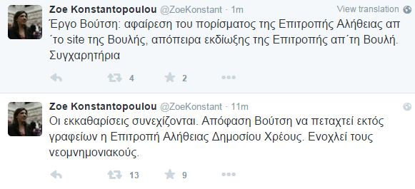 Αιχμές κατά του νέου Προέδρου της Βουλής, Νίκου Βούτση, αφήνει μέσω του λογαριασμού της στο twitter, η πρώην πρόεδρος της Βουλής, Ζωή Κωνσταντοπούλου. Η κυρία Κωνσταντοπούλου κατηγορεί τον κ. Βούτση για «αφαίρεση του πορίσματος της Επιτροπής Αλήθειας απ’ το site της Βουλής και απόπειρα εκδίωξης της Επιτροπής απ’ τη Βουλή».