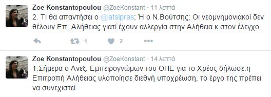 Αιχμές κατά του Πρωθυπουργού, Αλέξη Τσίπρα και του προέδρου της Βουλής, Νίκου Βούτση άφησε η πρώην πρόεδρος της Βουλής, Ζωή Κωνσταντοπούλου σχετικά με τις εργασίες της Επιτροπής Αλήθειας. Η κ. Κωνσταντοπούλου έγραψε στο λογαριασμό της στο twitter: