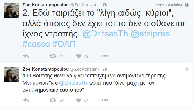 Νέα επίθεση στην κυβέρνηση εξαπέλυσε η Ζωή Κωνσταντοπούλου, με αναρτήσεις της στον προσωπικό λογαριασμό της στο Twitter.