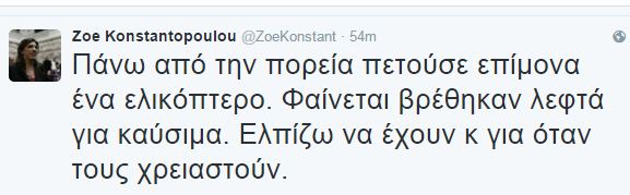 «Πάνω από την πορεία πετούσε επίμονα ένα ελικόπτερο. Φαίνεται βρέθηκαν λεφτά για καύσιμα. Ελπίζω να έχουν και για όταν τους χρειαστούν».