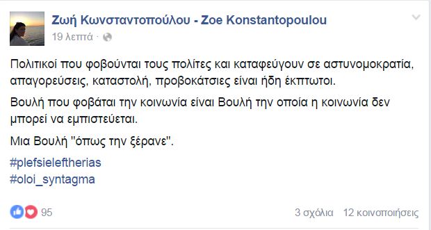«Πολιτικοί που φοβούνται τους πολίτες και καταφεύγουν σε αστυνομοκρατία, απαγορεύσεις, καταστολή, προβοκάτσιες είναι ήδη έκπτωτοι», αναφέρει η επικεφαλής της Πλεύσης Ελευθερίας, Ζωή Κωνσταντοπούλου, σε ανάρτηση της στο facebook, με αφορμή την ισχυρή αστυνομική παρουσία ενόψει των σημερινών συγκεντρώσεων στο κέντρο της Αθήνας για το ασφαλιστικό νομοσχέδιο που προωθεί η κυβέρνηση.