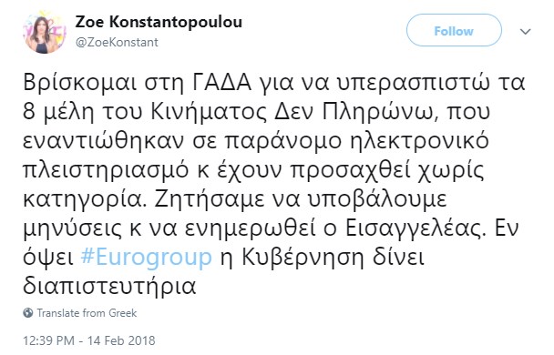 Με μηνύσεις απαντούν τα μέλη του «Δεν Πληρώνω» στις προσαγωγές των μελών τους από την αστυνομία, μέσω της συνήγορου τους Ζωής Κωνσταντοπούλου.