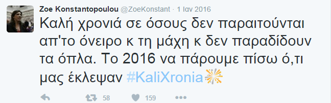 Τις ευχές της για το 2016 έστειλε με ανάρτηση της στο Twitter, η πρώην Πρόεδρος της Βουλής, Ζωή Κωνσταντοπούλου. Συγκεκριμένα, έγραψε: «Καλή χρονιά σε όσους δεν παραιτούνται από το όνειρο κ τη μάχη κ δεν παραδίδουν τα όπλα. Το 2016 να πάρουμε πίσω ό,τι μας έκλεψαν».