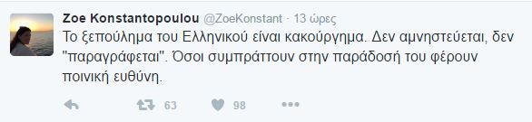 «Το ξεπούλημα του Ελληνικού είναι κακούργημα. Δεν αμνηστεύεται, δεν “παραγράφεται”», αναφέρει η επικεφαλής της Πλεύσης Ελευθερίας, Ζωή Κωνσταντοπούλου, με ανάρτηση στο Twitter, σχολιάζοντας την αποκρατικοποίηση του Ελληνικού.