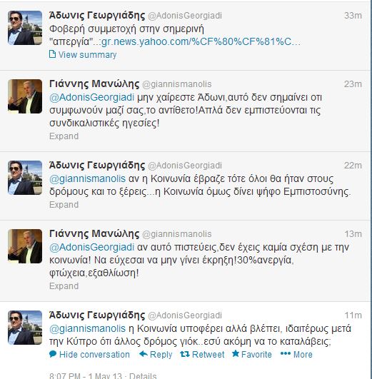 Τα “ξίφη” του διασταύρωσαν στο Twitter ο Άδωνις Γεωργιάδης και ο Γιάννης Μανώλης με αφορμή τις συγκεντρώσεις για τον εορτασμό της Πρωτομαγιάς.