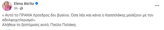Σε ανάρτησή της στον προσωπικό της λογαριασμό στο Facebook, η Έλενα Ακρίτα κάλεσε τον Παύλο Πολάκη να απαντήσει αν είπε στη συνεδρίαση της Πολιτικής Γραμματείας την φράση «Αυτό το ΠΡΑΜΑ πρόεδρος δεν βγαίνει. Όσα λέει και κάνει ο Κασσελάκης μοιάζουν με τον αδολφοχιτλερισμό».