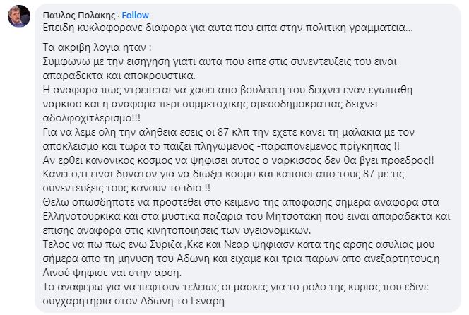Ο βουλευτής Χανίων απάντησε με σχόλιο, λέγοντας ότι «κυκλοφορούν διάφορα» για τα όσα είπε, και παρέθεσε την τοποθέτησή του στην ΠΓ. Συγκεκριμένα στην ανάρτησή του ανέφερε: