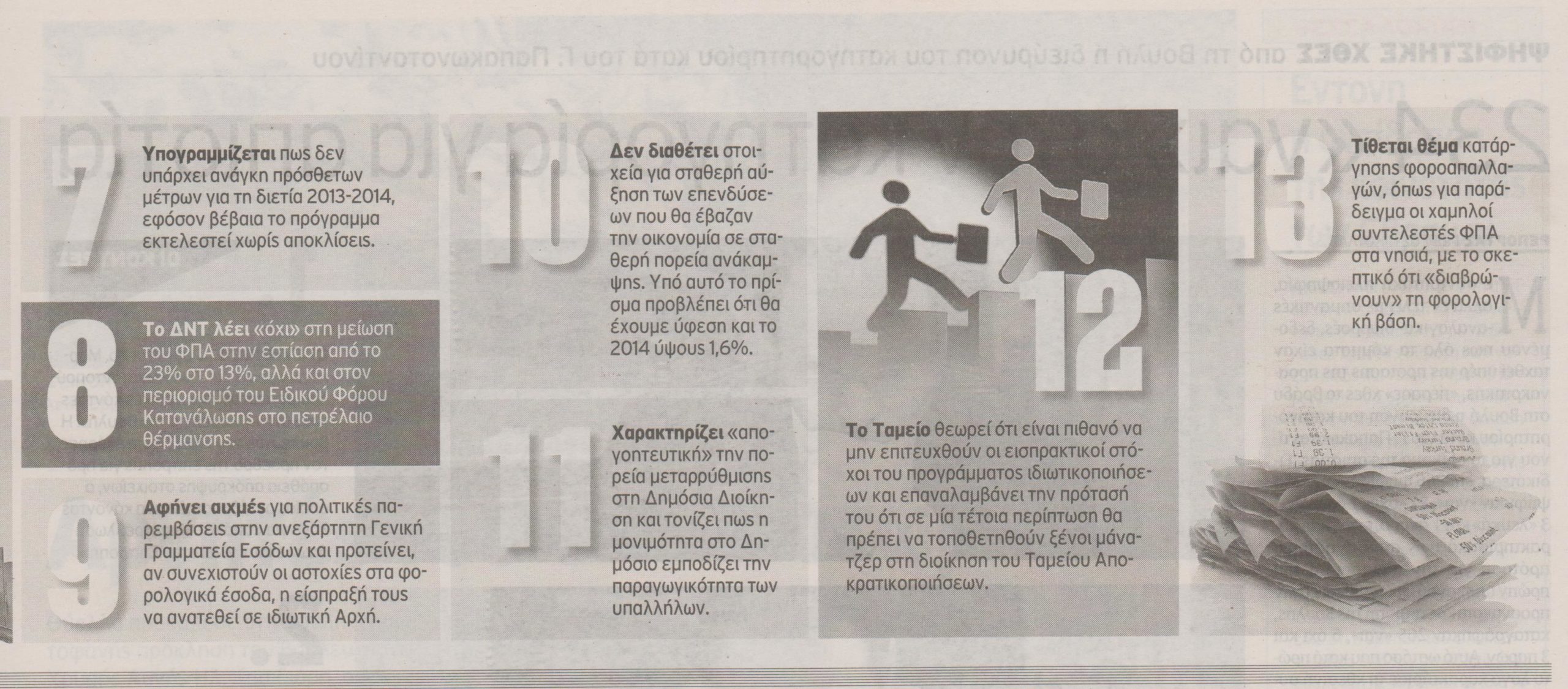 5. Τίθεται εμμέσως πλην σαφώς θέμα νέου κουρέματος, καθώς προτείνεται να εξεταστεί μια «εμπροσθοβαρής» μείωση του χρέους. Προβλέπεται δε ότι θα υπάρξει χρηματοδοτικό κενό 4,6 δισ. ευρώ το δεύτερο εξάμηνο του 2014.