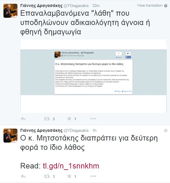 H απάντηση του Γιάννη Δραγασάκη ήρθε επίσης μέσω Twitter: “Ο κ. Μητσοτάκης διαπράττει για δεύτερη φορά το ίδιο λάθος. Όπως έκανε και τον περασμένο Φεβρουάριο, ο κ. Μητσοτάκης επιμένει να αγνοεί πως το Γραφείο του Αντιπροέδρου δεν διαθέτει διοικητικούς υπαλλήλους ή συμβούλους. Κάθε φορά λοιπόν γίνεται σύσταση του Γραφείου εκ του μηδενός με το απολύτως αναγκαίο για την κρίσιμη λειτουργία του προσωπικό.
