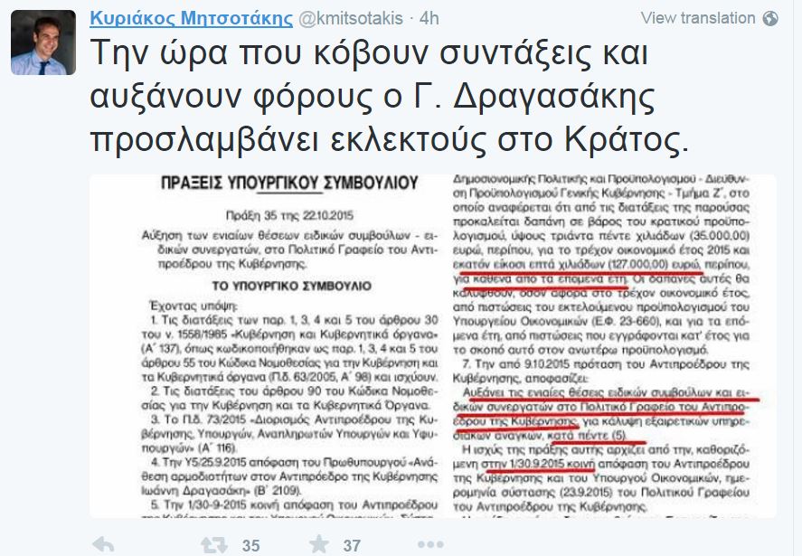 “Την ώρα που κόβουν συντάξεις και αυξάνουν φόρους ο Γ. Δραγασάκης προσλαμβάνει εκλεκτούς στο Κράτος” έγραψε στο Twitter ο βουλευτής της ΝΔ και υποψήφιος για την προεδρία του κόμματος και επισύναψε το σχετικό ΦΕΚ.