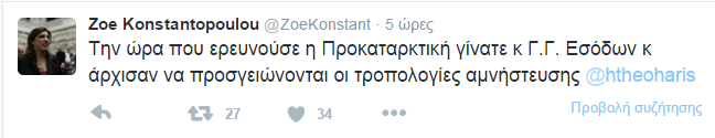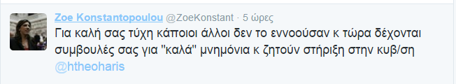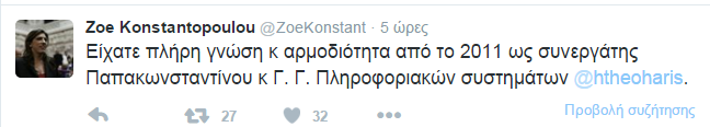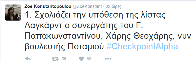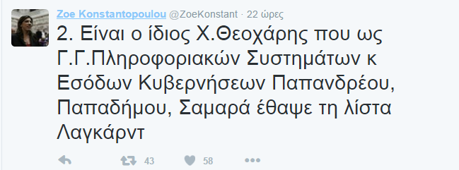 Διαδικτυακή κόντρα έχει ξεσπάσει ανάμεσα στην πρώην Πρόεδρο της Βουλής, Ζωή Κωνσταντοπούλου και τον βουλευτή του Ποταμιού, Χάρη Θεοχάρη. Η Ζωή Κωνσταντοπούλου με αναρτήσεις στο twitter κατηγόρησε τον κ. Θεοχάρη ότι ως Γ.Γ.Πληροφοριακών Συστημάτων και Εσόδων των κυβερνήσεων Παπανδρέου, Παπαδήμου, Σαμαρά έθαψε τη λίστα Λαγκάρντ.