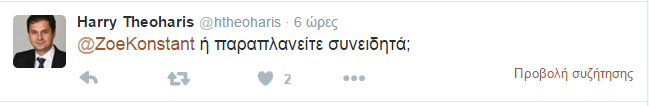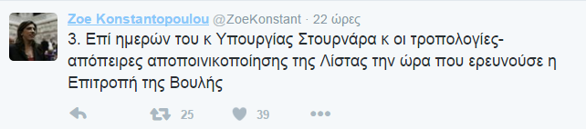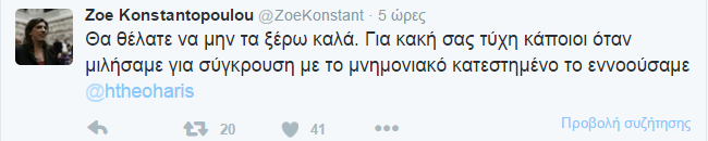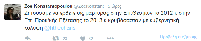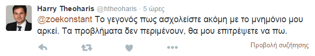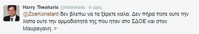 Από την πλευρά του, ο κ. Θεοχάρης και αυτός μέσω twitter, απάντησε στην Ζωή Κωνσταντοπούλου, λέγοντας της ότι δεν είναι σωστά ενημερωμένη καθώς ο ίδιος δεν έλαβε ποτέ την λίστα και υπογράμμισε ότι δεν κρύφτηκε ποτέ του.