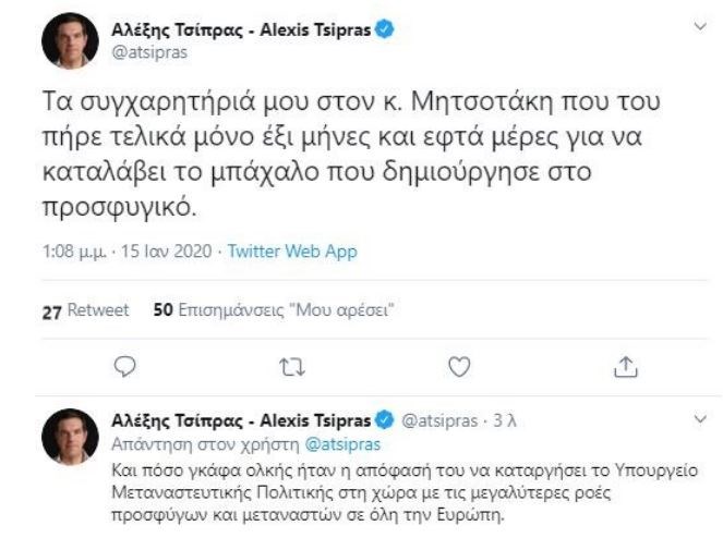 Νωρίτερα, ο πρόεδρος του ΣΥΡΙΖΑ έγραψε στον προσωπικό του λογαριασμό: “Τα συγχαρητήριά μου στον κ. Μητσοτάκη που του πήρε τελικά μόνο έξι μήνες και εφτά μέρες για να καταλάβει το μπάχαλο που δημιούργησε στο προσφυγικό”.