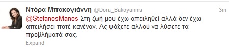 Διαμάχη ξέσπασε στο Twitter μεταξύ του Στέφανου Μάνου και της Ντόρας Μπακογιάννη. Αφορμή στάθηκε το σχόλιο του προέδρου της ΔΡΑΣΗΣ ότι ο υποψήφιος του κόμματος του στα Χανιά Γρηγόρης Αρχοντάκης δέχεται απειλές κατηγορώντας τη Νέα Δημοκρατία και τη Ντόρα Μπακογιάννη, η οποία αντέδρασε και του απάντησε.