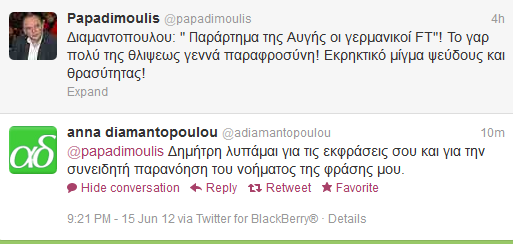 Την αντίδραση της Άννας Διαμαντοπούλου προκάλεσε το σχόλιο του Δημήτρη Παπαδημούλη στο Twitter για τη δήλωσή της σχετικά με το δημοσίευμα των γερμανικών Financial Times.”Το γαρ πολύ της θλιψεως γεννά παραφροσύνη! Εκρηκτικό μίγμα ψεύδους και θρασύτητας!”, έγραψε ο υποψήφιος βουλευτής του ΣΥΡΙΖΑ αναφερόμενος στη δήλωση της υποψήφιας βουλευτή του ΠΑΣΟΚ, η οποία με αφορμή το δημοσίευμα είπε ότι “οι Financial Times Deutschland λειτουργούν σαν παράρτημα της εφημερίδας Αυγή”. “Δημήτρη λυπάμαι για τις εκφράσεις σου και για την συνειδητή παρανόηση του νοήματος της φράσης μου”, απάντησε πριν από λίγο η κυρία Διαμαντοπούλου.
