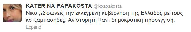 Τότε, η κα Παπακώστα απάντησε: “Νίκο, εξισώνεις την εκλεγμένη κυβέρνηση της Ελλάδος με τους κοτζαμπάσηδες; Ανιστόρητη και αντιδημοκρατική προσέγγιση”.