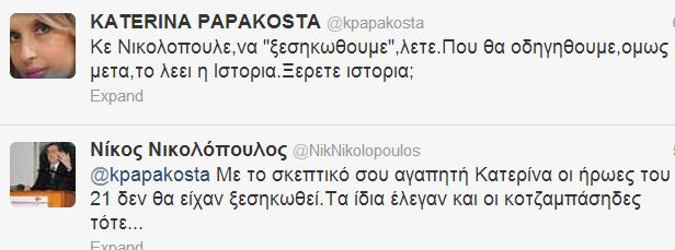 Και ο Νίκος Νικολόπουλος της απάντησε: “Με το σκεπτικό σου, αγαπητή Κατερίνα, οι ήρωες του ’21 δε θα είχαν ξεσηκωθεί. Τα ίδια έλεγαν και οι κοτζαμπάσηδες τότε…”.