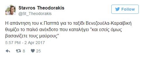 Σε σχετική ανάρτησή του στο twitter, λίγη ώρα αργότερα, ο Σταύρος Θεοδωράκης ανέφερε ότι «η απάντηση του κ.Παππά για το ταξίδι Βενεζουέλα-Καραϊβική θυμίζει το παλιό ανέκδοτο που καταλήγει “και εσείς όμως βασανίζετε τους μαύρους”».