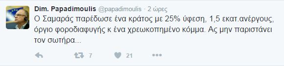 Συγκεκριμένα, ο κ. Παπαδημούλης έγραψε: «Ο Σαμαράς παρέδωσε ένα κράτος με 25% ύφεση, 1,5 εκατομμύρια ανέργους, όργιο φοροδιαφυγής και ένα χρεωκοπημένο κόμμα. Ας μην παριστάνει τον σωτήρα».