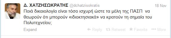 Την αντίδραση της Νεολαίας του ΠΑΣΟΚ προκάλεσε ένα σχόλιο του μέλους της Κεντρικής Επιτροπής της ΔΗΜΑΡ Δημήτρη Χατζησωκράτη στο Twitter αναφορικά με την σημαία του Πολυτεχνείου.