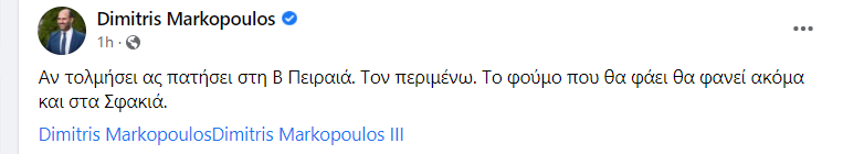 “Ψηφίστε να δούμε ποιος θα βγει τρίτος και αν θα βγεις στον Πειραιά” με αυτή την ατάκα έκλεισε ο κ. Πολάκης την ομιλία του. “Αν τολμήσει ας πατήσει στη Β Πειραιά. Τον περιμένω. Το φούμο που θα φάει θα φανεί ακόμα και στα Σφακιά” απάντησε ο κ. Μαρκόπουλος.