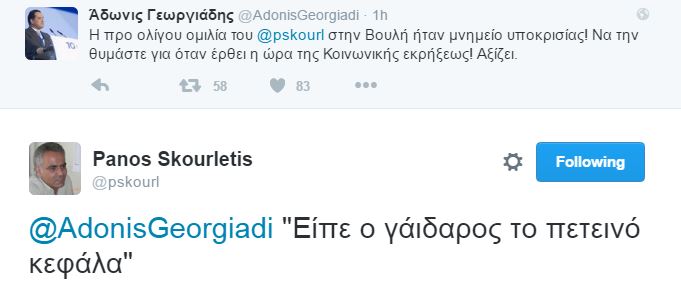 Κόντρα ξέσπασε, μέσω twitter, ανάμεσα στον υπουργό Περιβάλλοντος, Πάνο Σκουρλέτη και τον Αντιπρόεδρο της Νέας Δημοκρατίας, Άδωνι Γεωργιάδη. Αφορμή στάθηκε ένα tweet του κ. Γεωργιάδη αναφορικά με την ομιλία του κ. Σκουρλέτη στη βουλή, για το πολυνομοσχέδιο.