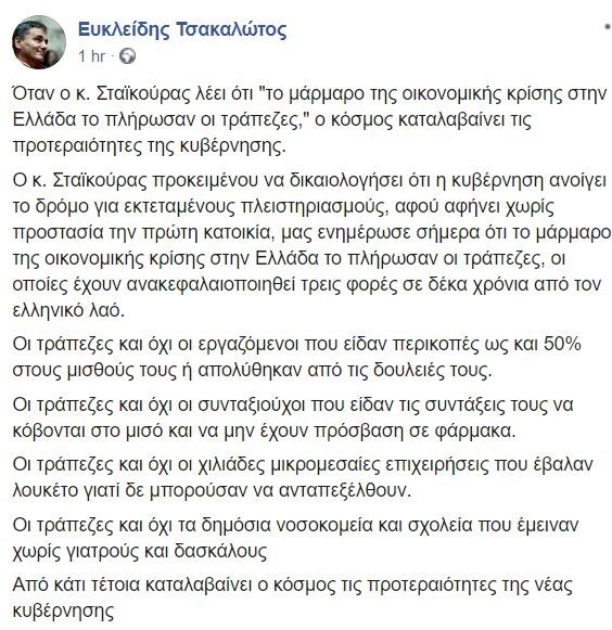 Όταν ο κ. Σταϊκούρας λέει ότι “το μάρμαρο της οικονομικής κρίσης στην Ελλάδα το πλήρωσαν οι τράπεζες,” ο κόσμος καταλαβαίνει τις προτεραιότητες της νέας κυβέρνησης, απάντησε ο τομεάρχης Οικονομικών του ΣΥΡΙΖΑ, Ευκλείδης Τσακαλώτος, με ανάρτησή του στο Facebook.