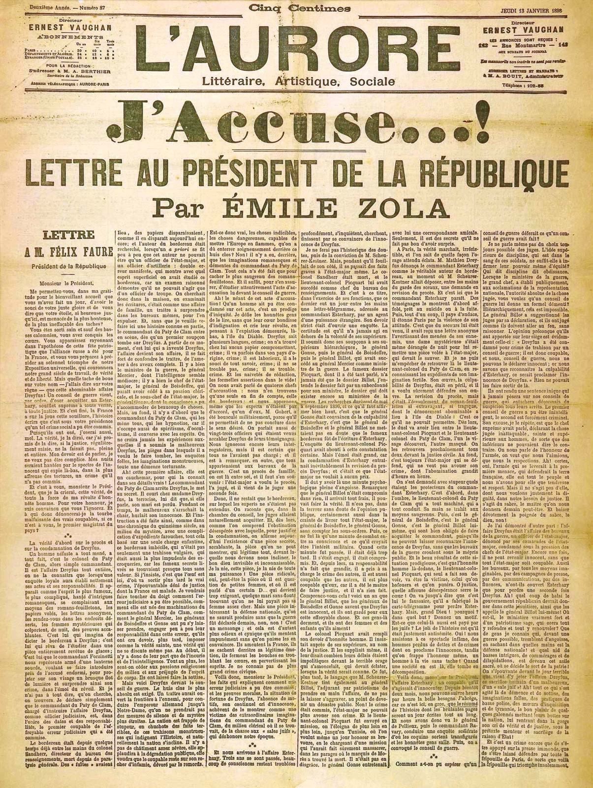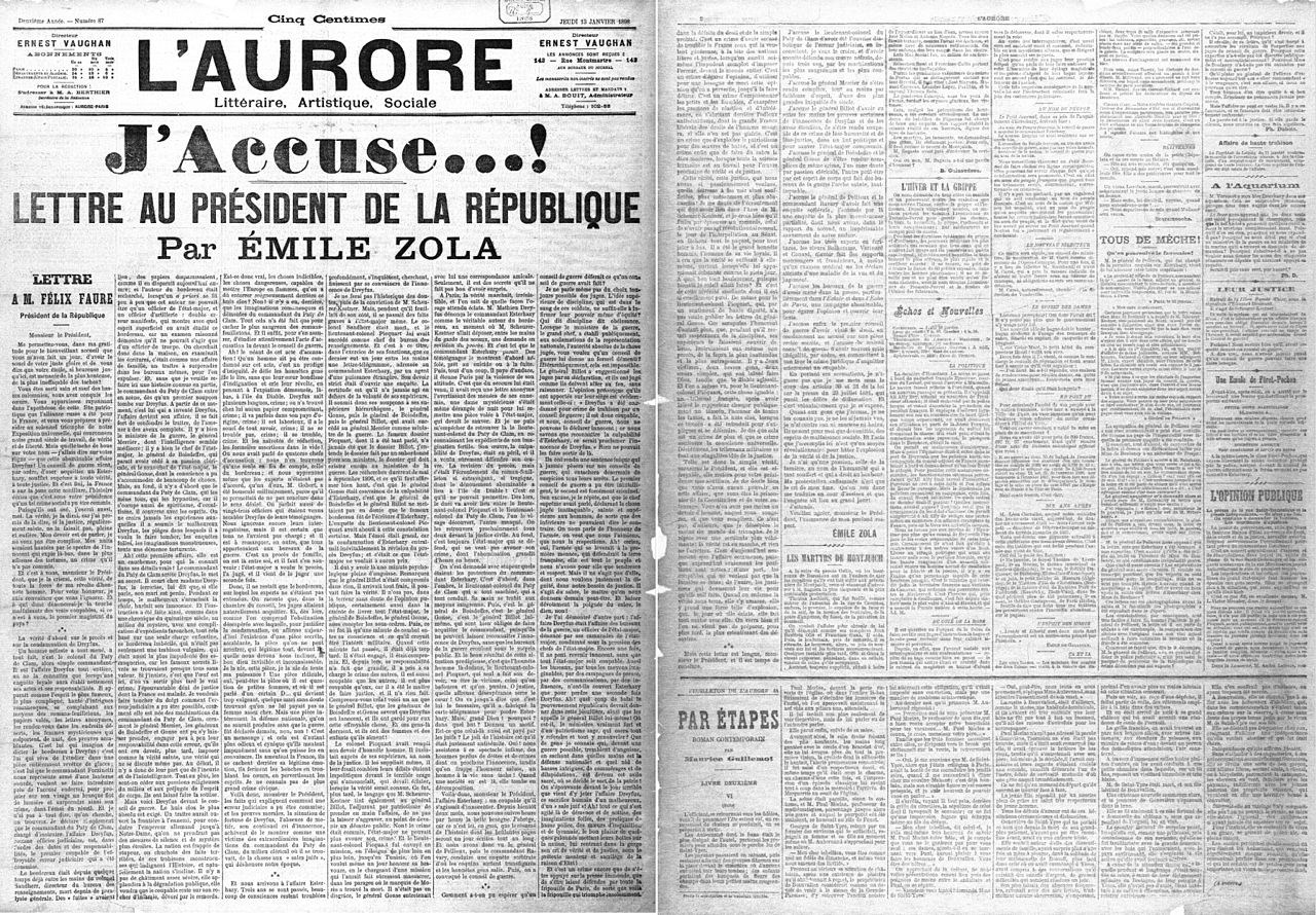 Ο Εμίλ Ζολά ήταν ο μόνος που υπερασπίστηκε τον εβραϊκής καταγωγής Γάλλο λοχαγό του πυροβολικού, Άλφρεντ Ντρέιφους, στέλνοντας ανοιχτή επιστολή στον Γάλλο πρόεδρο. Δημοσιεύτηκε στις 13 Ιανουαρίου του 1898 στο εξώφυλλο της παριζιάνικης καθημερινής εφημερίδας «L’ Aurore», του Ζορζ Κλεμανσό, υπό τον τίτλο “Κατηγορώ!”. Ο Ζολά ήταν αυτός που αποκάλυψε μία μηχανορραφία, η οποία κόστισε την ελευθερία στον στρατιωτικό Άλφρεντ Ντρέιφους εξαιτίας του αντισημιτισμού του υπουργείου Αμύνης. Η υπόθεση Ντρέιφους είναι µία δικαστική πλάνη που συντάραξε τη Γαλλία και τη χώρισε σε δύο στρατόπεδα. Η εφηµερίδα “L’ Aurore”, την ημέρα της δημοσίευσης της επιστολής του Ζολά έγινε ανάρπαστη, με πωλήσεις που έφθασαν τα 300.000 αντίτυπα, αντί των 30.000 που πωλούσε συνήθως. Η επιστολή αυτή προκάλεσε αίσθηση σε όλο τον κόσμο. Η πρόθεση του Ζολά ήταν να κατηγορηθεί ο ίδιος για συκοφαντική δυσφήμηση ώστε να δημοσιοποιήσει τα νέα αποδεικτικά στοιχεία προς στήριξη του Ντρέιφους.