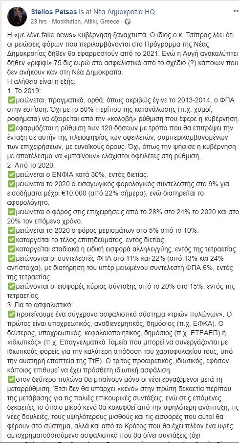 Η απάντηση ήρθε μέσω ανάρτησης του διευθυντή του πολιτικού γραφείου του Κυριάκου Μητσοτάκη, Στέλιου Πέτσα στο Facebook, όπου μεταξύ άλλων αναφέρεται και στο ασφαλιστικό, λέγοντας ότι η “Αυγή ανακαλύπτει δήθεν ριφιφί 75 δισ. ευρώ στο ασφαλιστικό από το σχέδιο κάποιων που δεν ανήκουν στη ΝΔ” και αναλύει ποιο είναι το πλάνο της ΝΔ για το συγκεκριμένο τομέα.